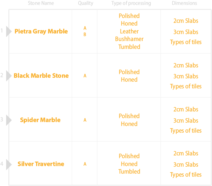 Gama Stone Group provides various types of processing and required dimensions for designers and manufacturers in different projects to satisfy their customers. The types of processing, dimensions, and quality of different types of stones can be provided according to the table below.